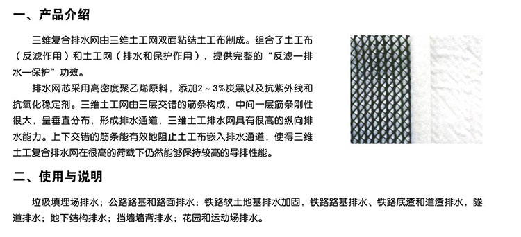 三維復(fù)合排水網(wǎng)是一種新型的排水土工材料。以高密度聚乙烯(HDPE)為原料,經(jīng)特殊的擠出成型工藝加工而成,具有三層特殊結(jié)構(gòu)。中間筋條剛性大,縱向排列,形成排水通道,上下交叉排列的筋條形成支撐防止土工布嵌入排水通道,即使在很高的荷載下也能保持很高的排水性能。雙面粘接滲水土工布復(fù)合使用,具有“反濾--排水--透氣--保護(hù)”綜合性能,是目前理想的排水材料。